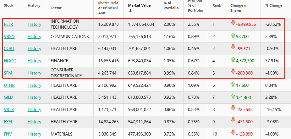 在前五大重仓股中,Palantir(PLTR.US)位列第一,持仓约1629万股,持仓市值约13.75亿美元,占投资组合比例为2.08%,持仓数量较上季度下降28.52%。