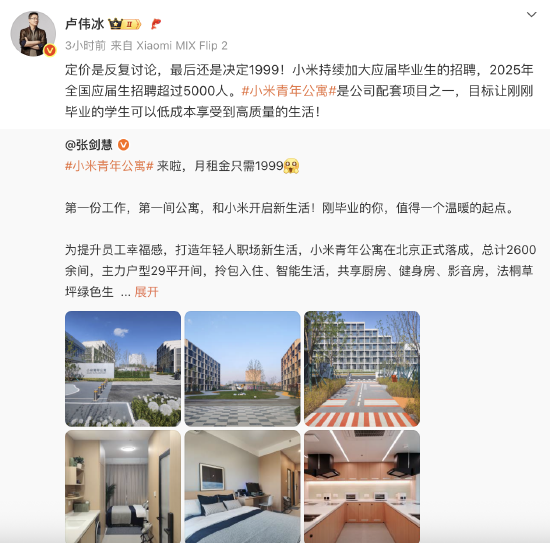 新浪科技讯 7月1日下午消息,小米集团合伙人卢伟冰发文回应小米青年公寓定价:定价是反复讨论,最后还是决定1999!他还表示,小米青年公寓的目标是让刚刚毕业的学生可以低成本享受到高质量的生活。
