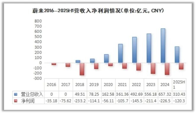 最新发布的半年报显示,2025年蔚来公司累计交付新车11.42万辆,营收310.43亿元,同比增长13.49%;但归母净亏损高达120.32亿元,较去年上半年扩大16.48亿元,成为2019年以来,亏损额度最高的上半年。蔚来已经让人无法理解,车卖得越多、收入越高,亏损越多。