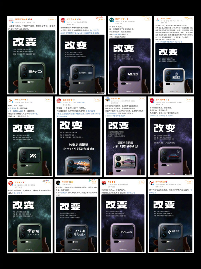 【太平洋科技快讯】昨日,比亚迪、理想、深蓝、智己、东风日产等多家汽车品牌通过官方社交平台为即将发布的小米 17 系列发声预祝,形成跨行业互动热潮。部分品牌的 Logo 更直接亮相于小米 17 Pro 的背屏,使其成为国产品牌的集中展示区,网友感叹“小米的朋友圈太强了”。