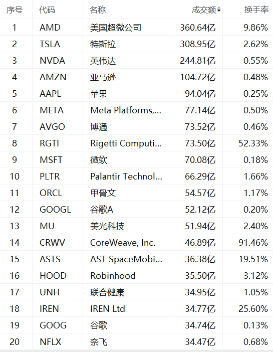 周三美股成交额第1名美国超微公司收高11.37%,股价再创历史新高,成交360.64亿美元。