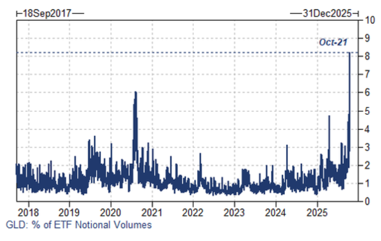 据高盛的数据,黄金ETF GLD的成交额一度占到美国所有上市ETF名义总成交额的8%,这是其数据库中有记录以来的最高份额。