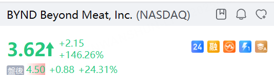 以植物肉替代品闻名的食品公司Beyond Meat近日涨势凶猛,表现惊人。在经历了周一暴涨127%之后,涨势仍未停歇,周二暴涨超146%、盘后再涨超20%,创下历史上单日最大涨幅。