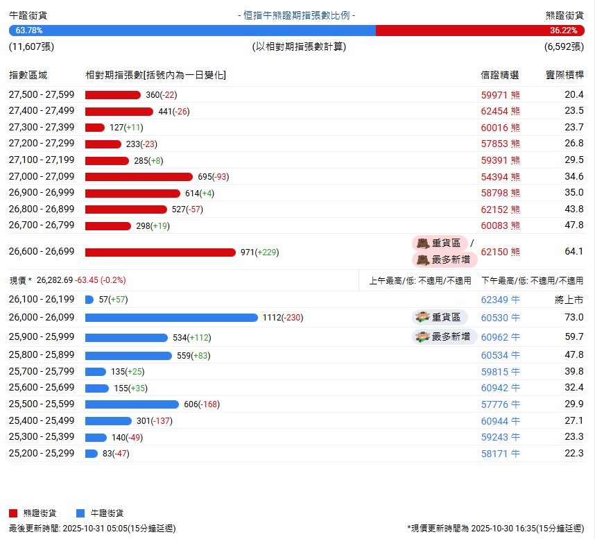 中信证券牛熊证街货分布图中的数据显示,熊证街货重货区和最多新增都在26600-26699区间,该区间最新熊证数量为971张,较上一交易日增加229张。