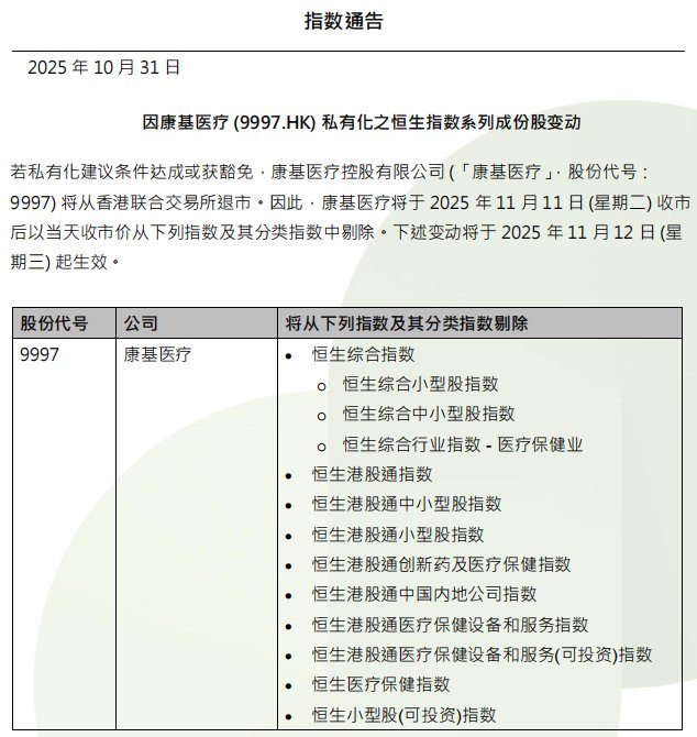 智通财经APP获悉,10月31日,恒指公司发布通告,若私有化建议条件达成或获豁免,康基医疗控股有限公司(康基医疗,09997)将从香港联合交易所退市。因此,康基医疗将于2025年11月11日(星期二)收市后以当天收市价从恒生综合指数及其分类指数中剔除。下述变动将于2025年11月12日(星期三)起生效。