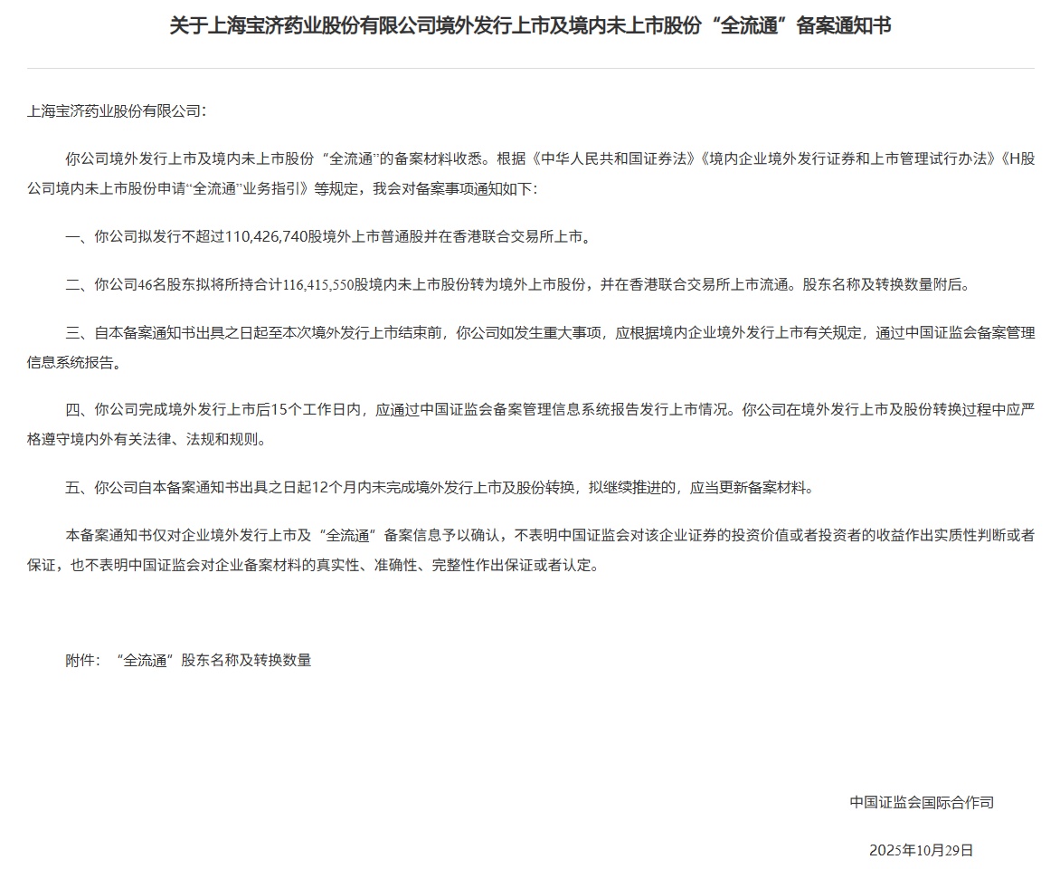 10月29日,中国证监会国际合作司发布《关于上海宝济药业股份有限公司境外发行上市及境内未上市股份“全流通”备案通知书》。公司拟发行不超过110,426,740股境外上市普通股并在香港联合交易所上市。公司46名股东拟将所持合计116,415,550股境内未上市股份转为境外上市股份,并在香港联合交易所上市流通。