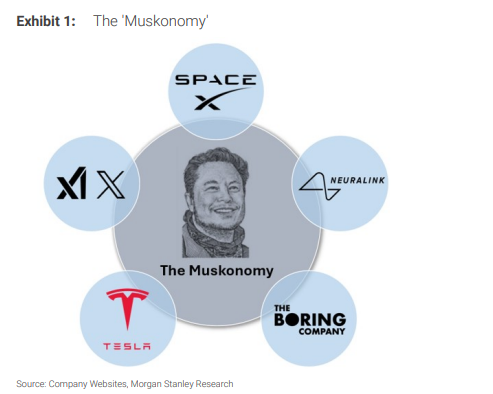 摩根士丹利认为,特斯拉与xAI的关系、全自动驾驶(FSD)的突破性进展、芯片垂直整合战略、分布式推理云网络、太空AI卫星,以及Cybercab的革命性生产方式,都将重塑特斯拉的长期价值。这些战略布局远超传统汽车制造商的范畴,指向一个由AI驱动的"马斯克经济体"(Muskonomy)。