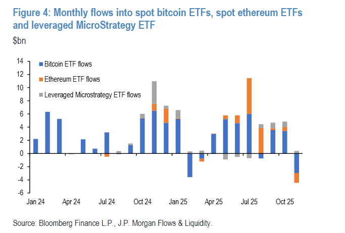 11月加密货币市场的调整主要由非加密货币原生投资者推动,特别是通常通过现货比特币和以太坊ETF投资的散户。摩根大通数据显示,11月散户抛售现货比特币和以太坊ETF约40亿美元,超过了今年2月的抛售规模。