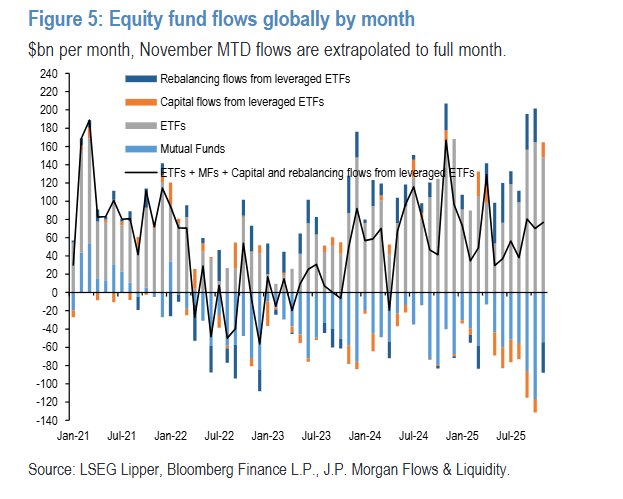 然而,在股票市场,情况恰恰相反。散户投资者正积极“逢低买入”。截至11月18日,全球股票ETF的月度至今(MTD)净流入高达960亿美元。按此速度推算,整个11月的股票ETF净流入可能达到1600亿美元,与前两个月的热度相当。