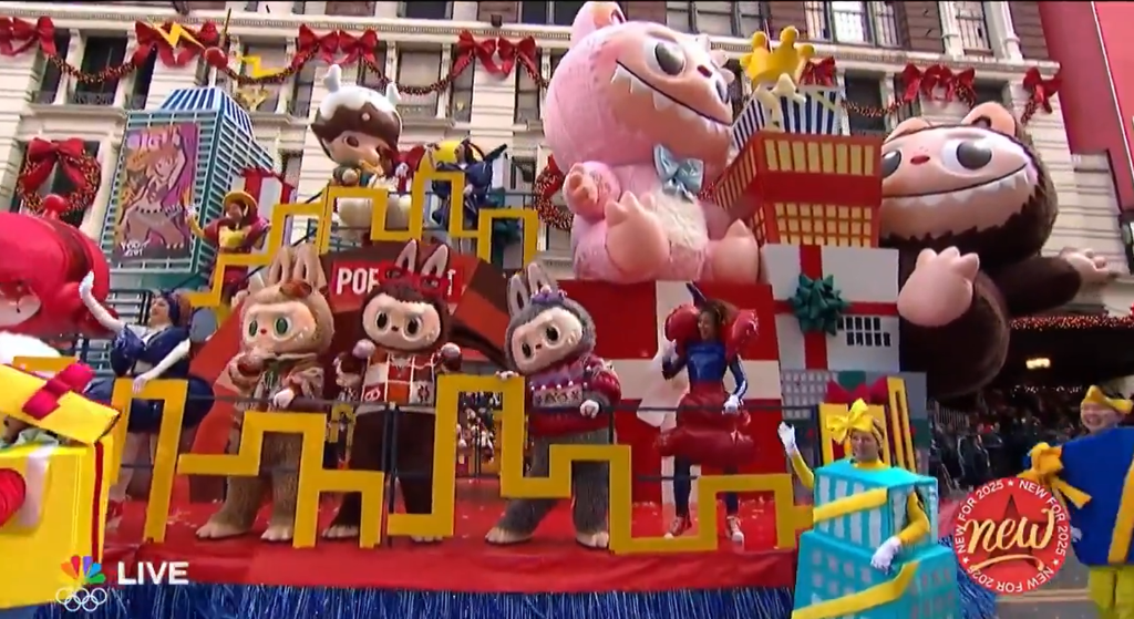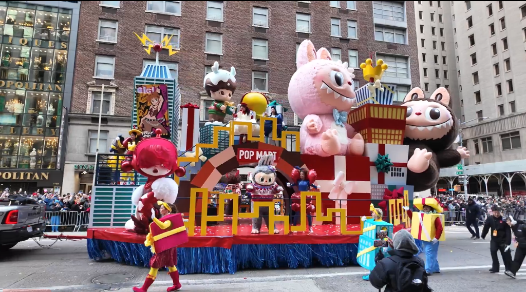 在今年的梅西感恩节大游行中,泡泡玛特与梅西百货工作室合作推出了名为“Friendsgiving in Pop City”的主题花车。