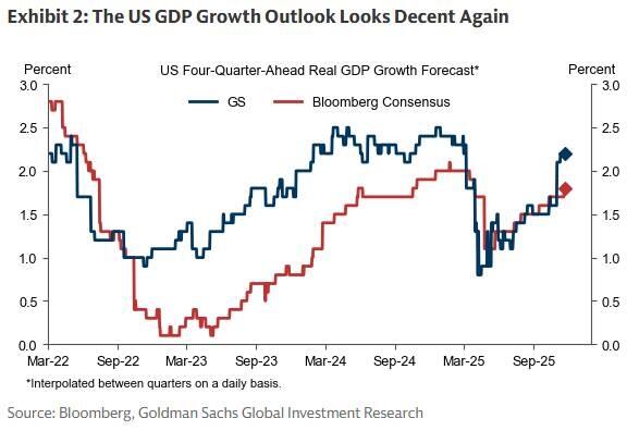 关于明年的政策路径,高盛认为情况更为复杂,需要在劳动力市场软化与即将到来的增长顺风之间进行权衡。分析师多次指出,增长前景将受到多种因素支撑,其中最显著的是“大而美法案”落地带来的财政顺风。