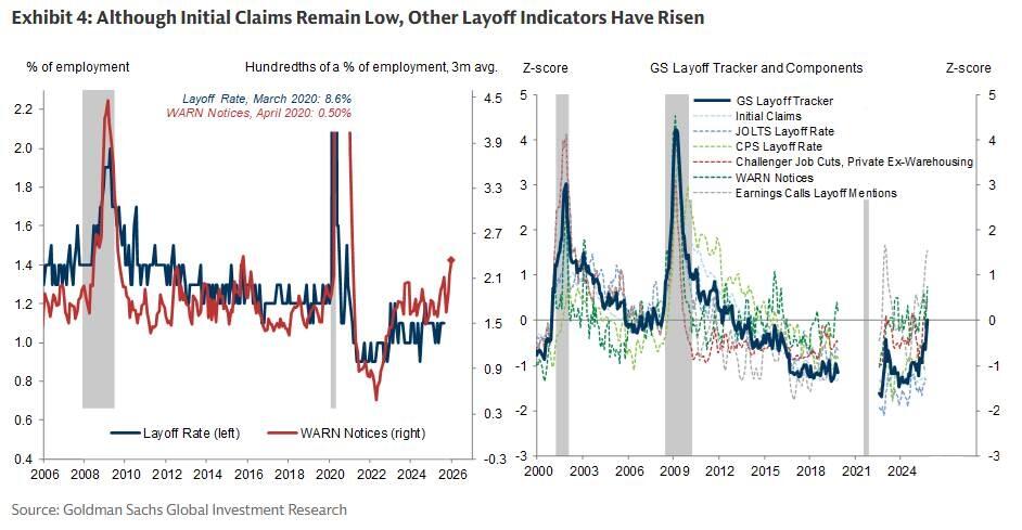 此外,各类裁员追踪指标正在发出令人担忧的信号。Challenger数据、WARN通知以及第三季度财报电话会议中提及裁员的数量在近几个月均有所增加。