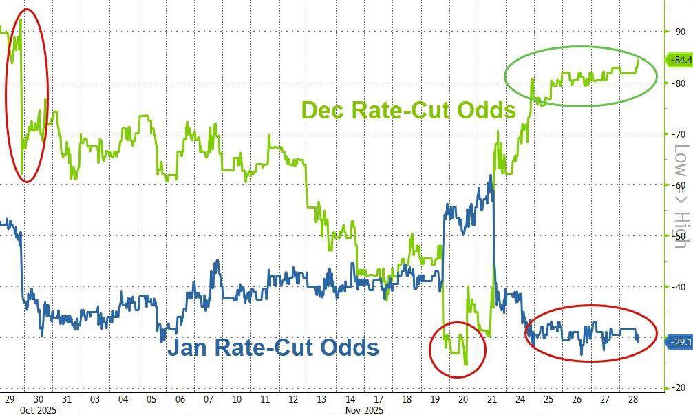 高盛FICC分析师Rikin Shah和Cosimo Codacci-Pisanelli在报告中指出,通往12月美联储会议的道路颇为颠簸,但最终结果已逐渐清晰。Williams上周五的言论不仅暗示了委员会内部对降息的支持,还直接推动了市场定价的修正,使其回升至21个基点。
