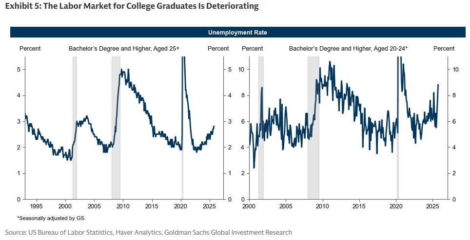 高盛全球投资研究(GIR)的数据特别指出了受过大学教育的劳动者就业状况的显著恶化——在20至24岁年龄段中,该群体的失业率目前已达8.5%。