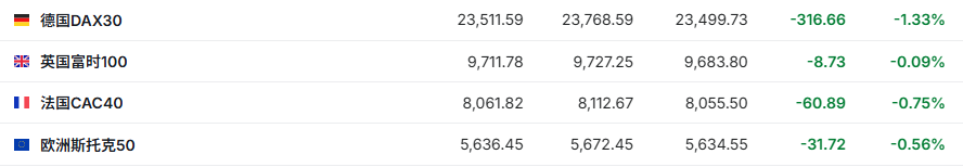 2. 截至发稿,德国DAX指数跌1.33%,英国富时100指数跌0.09%,法国CAC40指数跌0.75%,欧洲斯托克50指数跌0.56%。