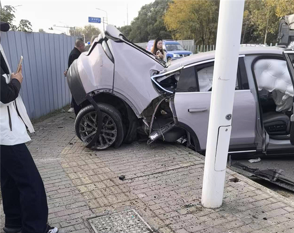 从现场实拍图看,一辆EC6撞断了路边的水泥墩护栏,并殃及了路灯杆,四轮全部爆胎,安全气囊也系数弹出。