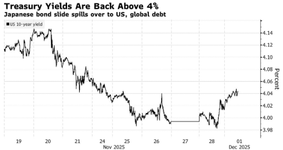 感恩节后首个交易周,美国国债市场开局不利,因为日本国债价格的下跌波及了全球债券市场。美国10年期国债的收益率上升了3个基点,至4.04%。此前,日本同类债券收益率大幅上涨,达到自2008年以来的最高水平,原因是市场预计日本央行本月晚些时候将加息,这一上涨还推高了从欧洲到新西兰的各类公债收益率。