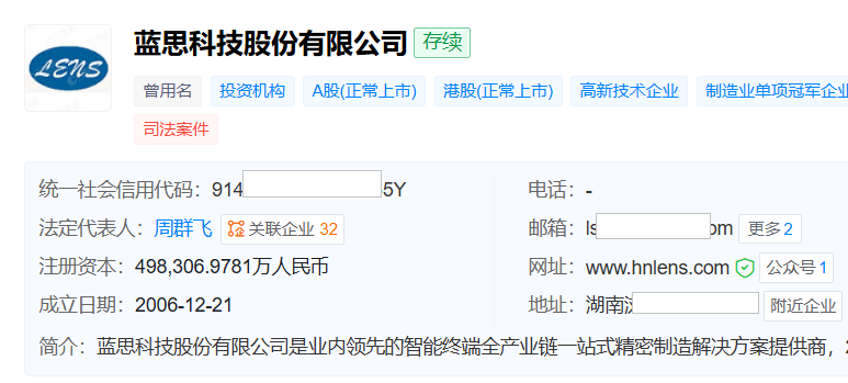 天眼查显示,蓝思科技成立于2006年12月,位于湖南省,2015年3月在深交所创业板上市,2025年7月在港交所上市。