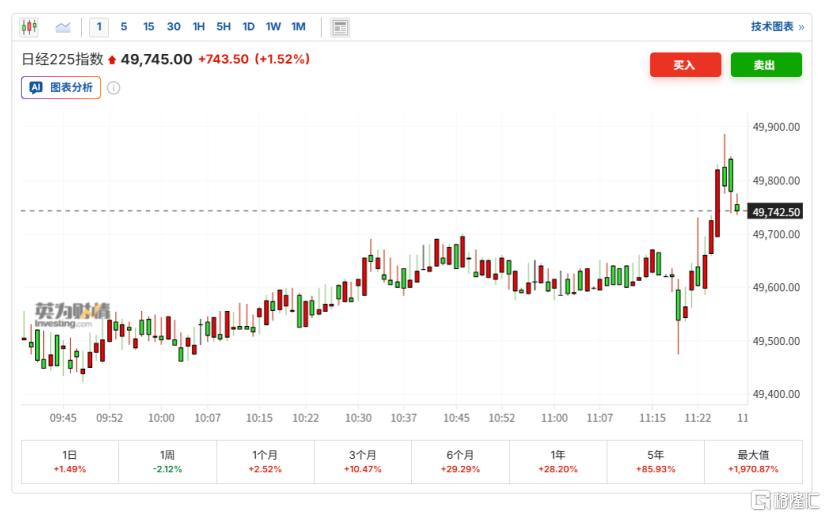 日经225指数小幅走高,现涨1.52%。