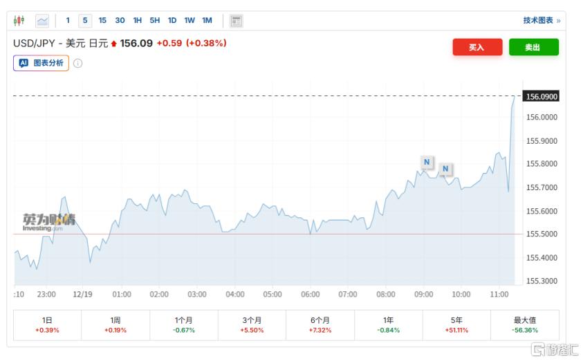 受此影响,美元兑日元突破156,日内涨0.38%。