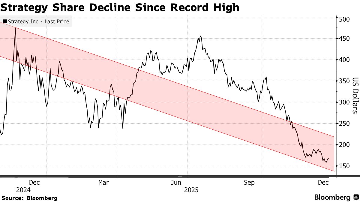 数据显示,自10月初创下历史新高以来,比特币已下跌约30%。同期,Strategy的股价暴跌超50%。根据该公司网站数据,其关键估值指标mNAV(即公司企业价值与其所持比特币价值的比值)在周一约为1.1。这提醒人们,投资者仍然担忧该指标可能在曾享有显著溢价后,很快转为负值。