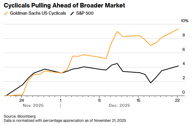此外,周期股的表现也已超越防御股。此前在10-11月科技板块回调引发的小型风格切换中,防御股曾是最大受益者。高盛另一项交易策略——做多非大宗商品类周期股、做空防御股——近一个月收益同样达到10%。