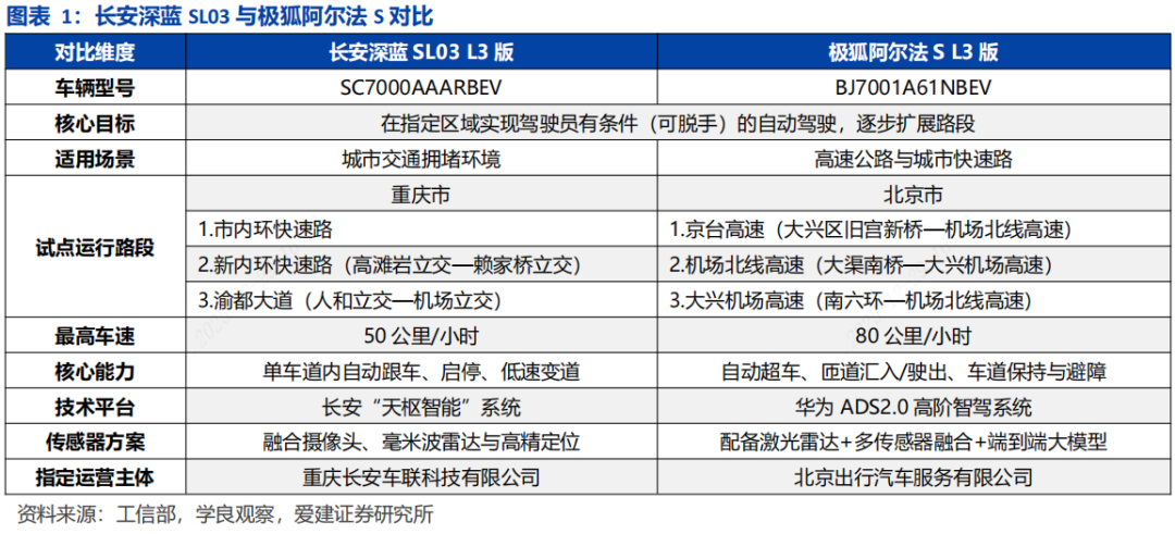 ■L3准入破冰,自动驾驶从测试迈向有条件运营。我国首次对量产乘用车开放L3级自动驾驶许可,严格限定区域、速度及使用主体,L3系统激活后责任主体为车企或系统供应商。该车型暂限试点使用单位运营,不向个人销售。获批车型1)长安深蓝SL03:重庆指定高速及城市快速路实现最高50km/h的单车道自动驾驶,适用路段包括内环快速路、新内环快速路及渝都大道等。2)极狐阿尔法S5:北京部分高速路段实现最高80km/h的单车道自动驾驶,适用路段包括京台高速、机场北线高速及大兴机场高速等。