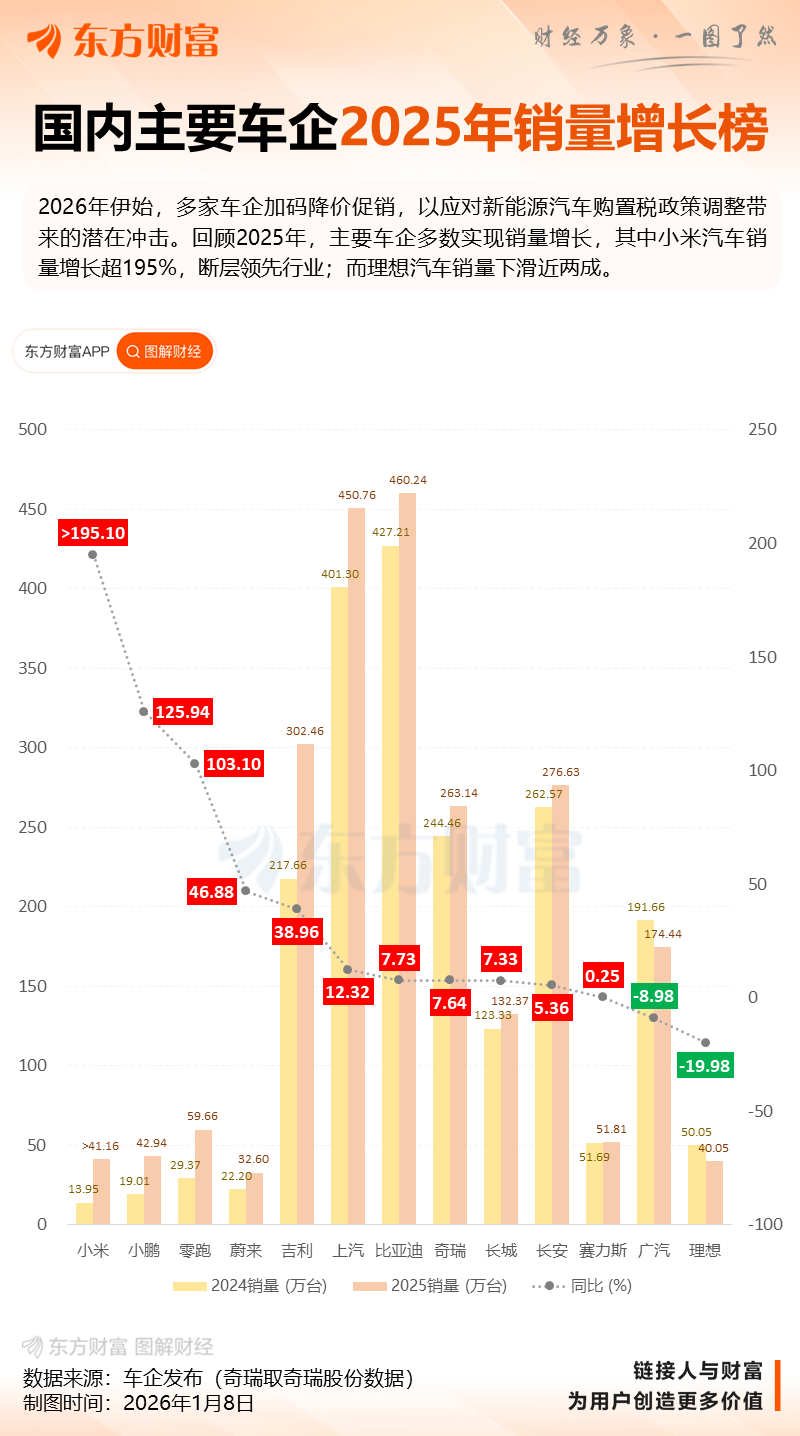 小米增速断层领先!一图速览2025年国内主要车企销量及增速