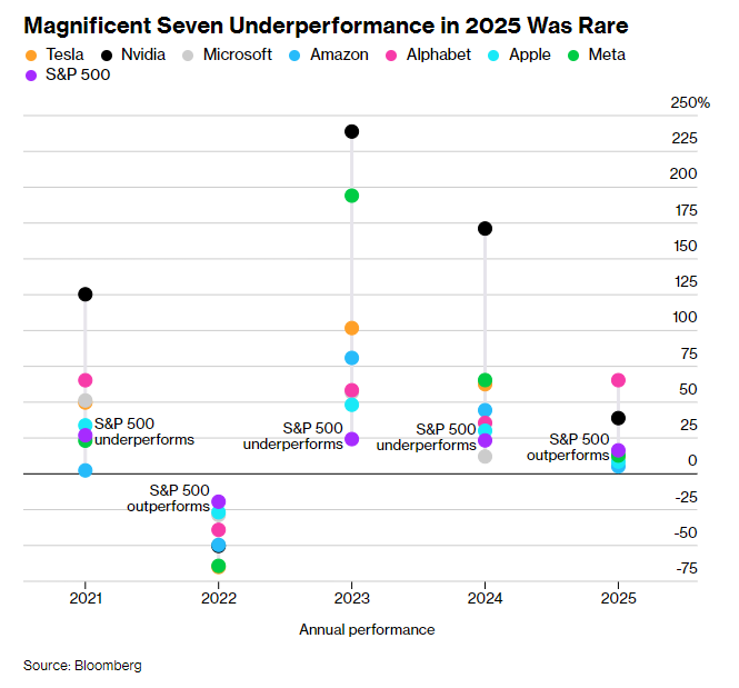 这一策略曾在很长一段时间内为投资者带来丰厚回报,但在2025年却黯然失效。自2022年美联储开启加息周期以来,“七科技”中多数公司的表现首次落后于标普500指数。尽管一项衡量“七巨头”表现的指数在2025年上涨25%,高于标普500指数的16%,但这一涨幅完全依赖谷歌(GOOGL.US)和英伟达(NVDA.US)两家公司的强劲拉升。
