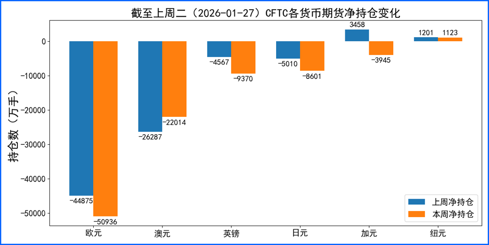 据美国商品期货委员会公布的2026-01-27期货市场头寸持仓报告显示,上周各货币的报告总持仓情况如下:欧元净空头变化6061手,澳元净多头变化4273手,英镑净空头变化4803手,日元净空头变化3591手,加元净空头变化7403手,纽元净空头变化78手,上周总持仓多空转换的货币有:加元。除此之外,单向总持仓变动超过20%的货币有:英镑,日元。