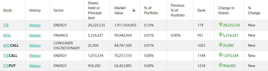 值得注意的是,小摩在第四季度还大举新建仓了能源巨头道达尔(TTE.US)。此前,高盛公布的第四季度13F也显示新建仓道达尔。
