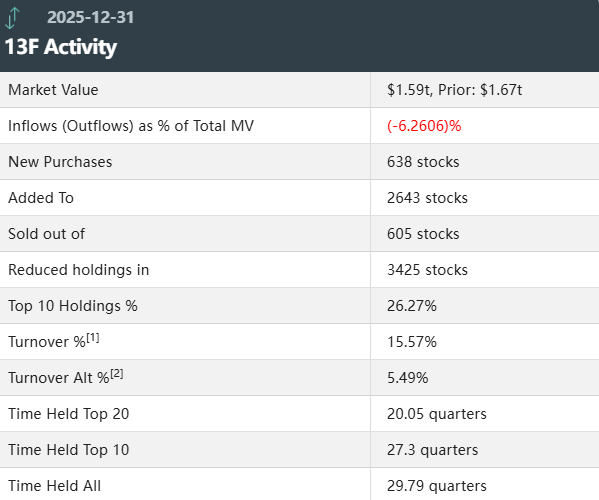 据统计,摩根大通第四季度持仓总市值为1.59万亿美元,上一季度总市值为1.67万亿美元。该基金在第四季度的投资组合中新增了638只个股,增持了2643只个股,减持了3425只个股,清仓了605只个股。其中前十大持仓标的占总市值的26.27%。