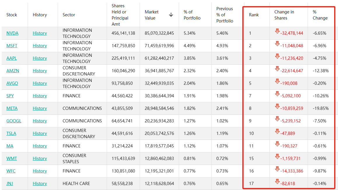 英伟达(NVDA.US)位列第一,持仓4.56亿股,持仓市值约911.7亿美元,占投资组合比例为5.34%,较上季度持仓数量减少6.65%。