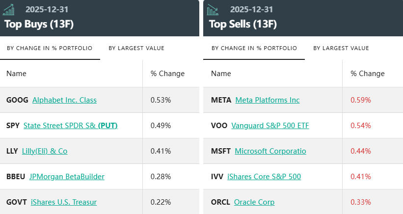 前五大卖出标的包括:Meta(META.US)、Vangurd标普500 ETF(VOO.US)、微软(MSFT.US)、iShares核心标普500ETF (IVV.US)、甲骨文(ORCL.US)。