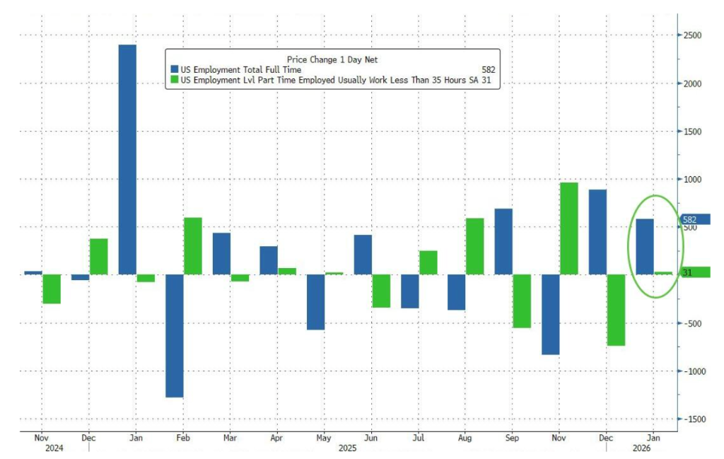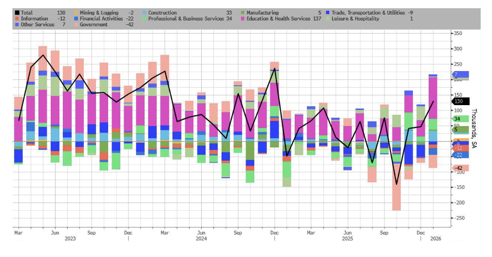 1月非农增长主要由医疗保健部门驱动,该行业亦是2025全年就业扩张的主要引擎。建筑业、专业与商业服务业岗位亦录得增长,制造业出现今年以来首次月度正增长。相比之下,临时帮助服务就业持续收缩,1月减少4.2万人,过去六个月中第五个月下降。