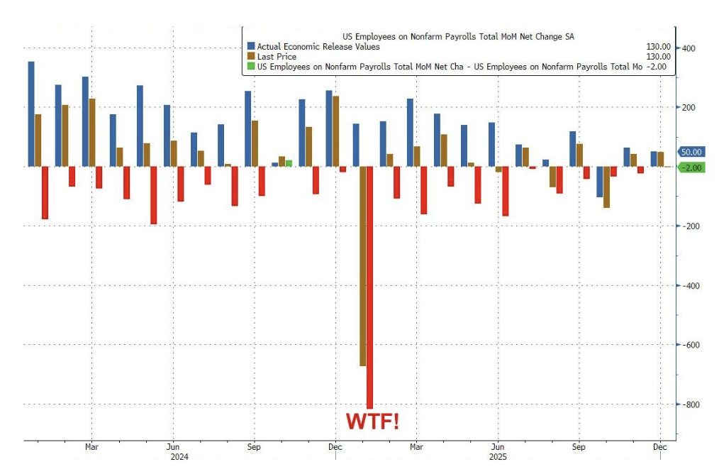 但本次报告同时将2025年全年就业增长规模由最初报告的58.4万大幅下调至18.1万,基准修正幅度显著,表明去年劳动力市场的实际疲软程度远超此前认知。