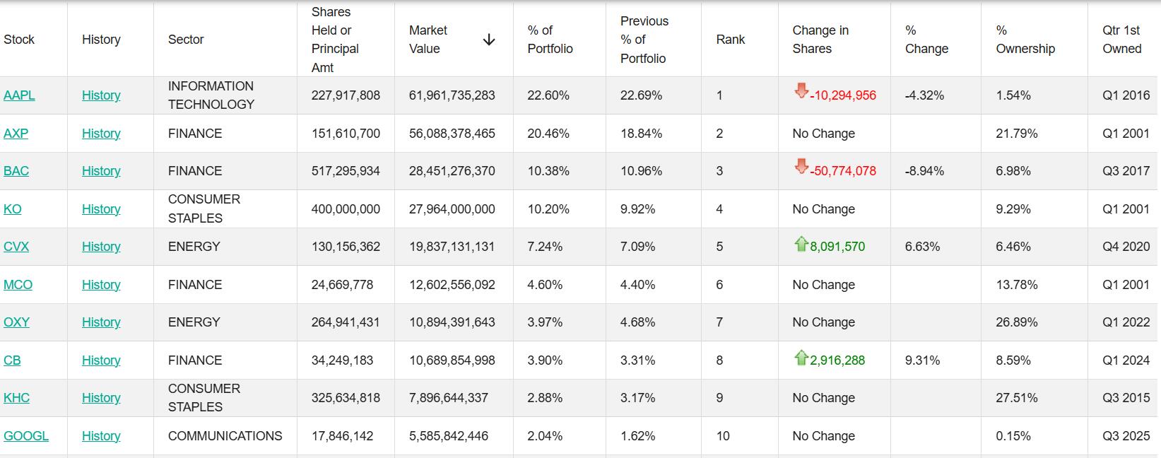 到四季度末,以持仓市值计,伯克希尔的十大重仓股都是前一季的“老面孔”,排名大多和三季度相同,只有穆迪和西方石油的排名对换。