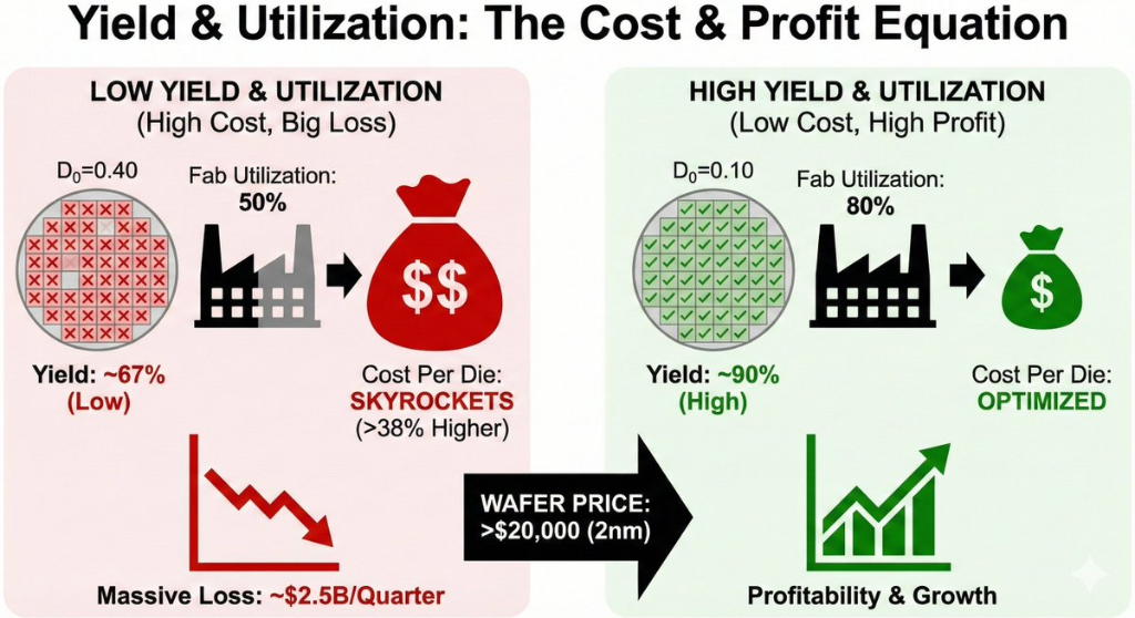 这种技术差距最终转化为严酷的经济账。代工经济学的核心是良率与产能利用率。在先进节点,单片晶圆成本超过2万美元,良率从65%提升至90%意味着单颗芯片成本下降超过38%。同时,低产能利用率会导致巨额的固定成本分摊。英特尔代工目前的亏损,正是低良率与低利用率双重叠加的结构性后果。缺乏外部产量导致学习数据不足,良率爬坡慢,进而推高成本,削弱竞争力,难以获取新客户——这是一个亟待打破的负向循环。