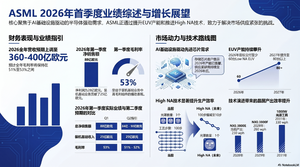 此外,产能目标与技术突破进一步强化信心: 2026年Low NA EUV出货至少60台,2027年至少80台。技术层面,1000瓦光源确保Low NA延伸至2031年;High NA可将掩模从3块减至1块、工艺步骤从100步压缩至10步,覆盖未来3至4个节点。