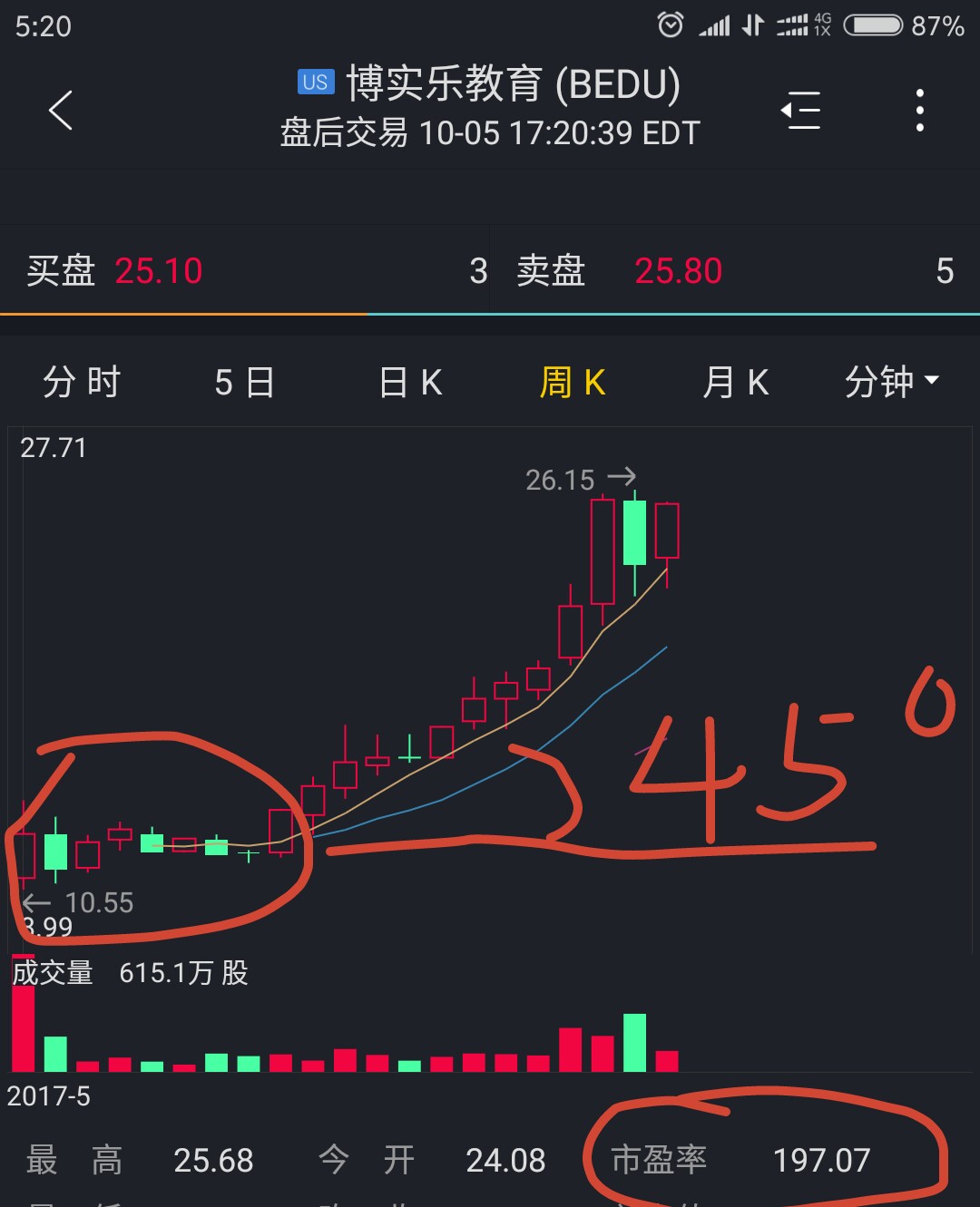 $红黄蓝(RYB)$ 一觉醒来发现被套了,不过也根本不着急,中股思维我早就放弃了,中股被套很麻烦,甚至主力会狠砸,主力很一致的砸,甚至散户也跟风砸。只要是有业绩,发展好的美股,回落后必有逢低买入的机构,所以连续下跌很难。之前在博实乐上赚钱了,但最初买博实乐,也是被套的很深😊,所以对于红黄蓝根本不着急👌。看看博实乐的周线图,上市之初也是大涨一周大跌一周,接着是涨两周跌一周,涨一周再跌两周,几乎是横盘了八周,然后就是45°角的连续上攻,到现在股价翻倍,市盈率197.7倍,这么高的市盈率是高成长型公司的市盈率。就算我目前短线对红黄蓝有一周的误判,我承认误判。但中长线走出博实乐行情的概率很大,所以依然看好,并且逢跌坚决加仓。