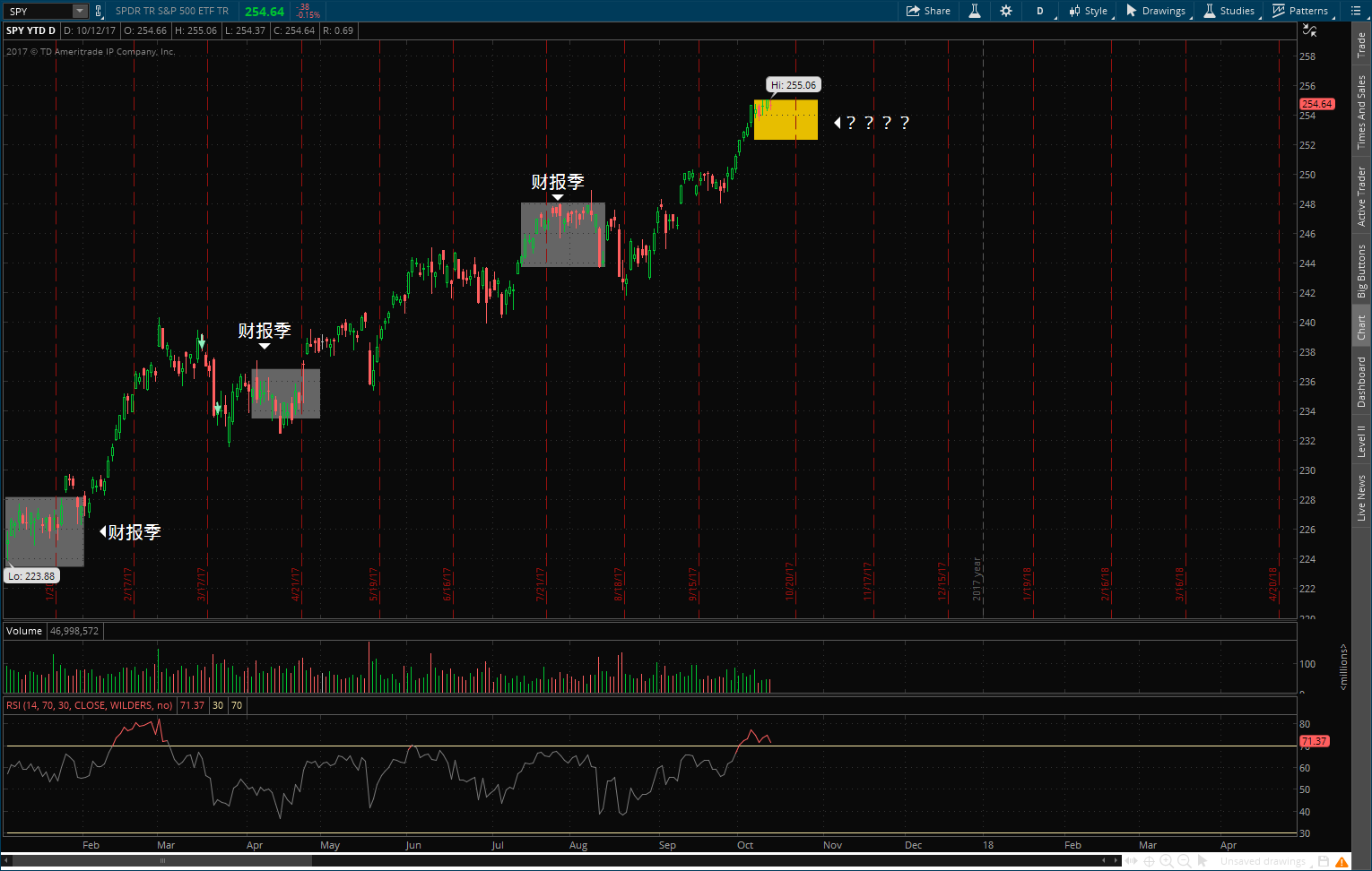 大盘在财报期季节,一般以盘整为主,考虑到这段时间很多股票都处于超买阶段,我个人不太想在过多的提高仓位。图为标普在财报季的表现。