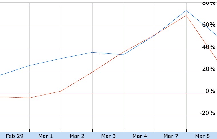 图中红色是GUSH,蓝色是UWTI,大家可以看到从上周一到前天,GUSH获利接近70%!即使算上昨天的大跌,仍有超过30%的收益。