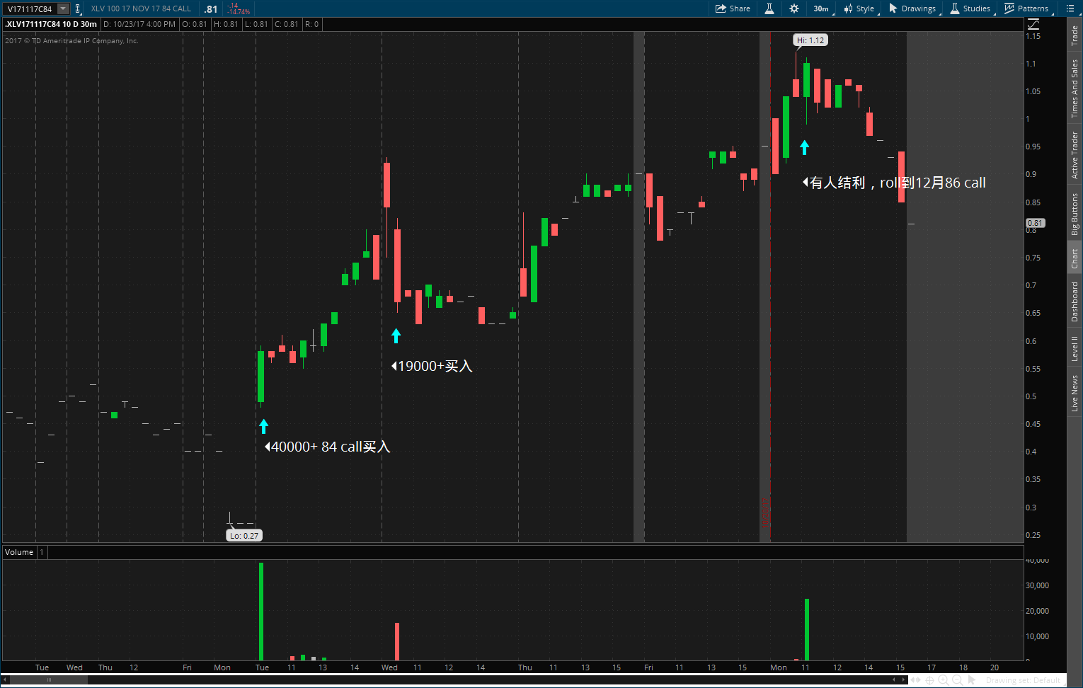 今天由于大盘的原因,并没有选择急于进场,我在未来几天按照XLV的上面的思路,会考虑入XLV dec 86的看涨期权。