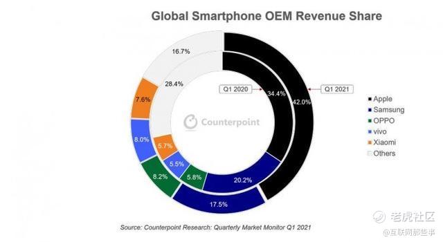 上表为2021年Q1全球手机利润分布图,从中可以看出,一季度全球手机行业利润突破了一亿美元,这其中,单苹果一家,就干走了42%的份额,就问你恐不恐怖?排名第二的是三星,拿走34.4%的份额,小米排在第5,份额为13.3%。不算三星和苹果,在国内,小米的盈利水平也是在OPPO和vivo之后的。