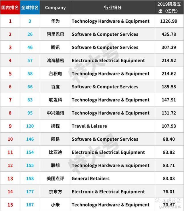 小米排名中国第15,全球第187,2019年研发投入70.47亿元,另据雷军在2021年1月7日的小米百万美金技术大奖颁奖典礼上透露,2020年,小米总共投入了100亿人民币做研发,排进了中国公司的前20名。
