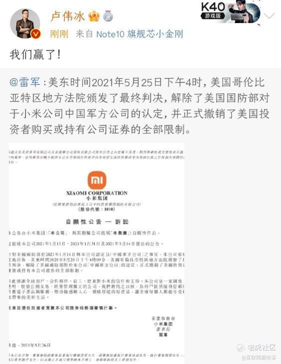 2021年5月26日上午,雷军第一时间转发小米被美国移出制裁名单的好消息,随后小米中国区总裁卢伟冰秒速跟转,并佐以“我们赢了!”的文案,在异国他乡,凭法律武器,赢了官司,也难怪小米高层大有扬眉吐气之感。