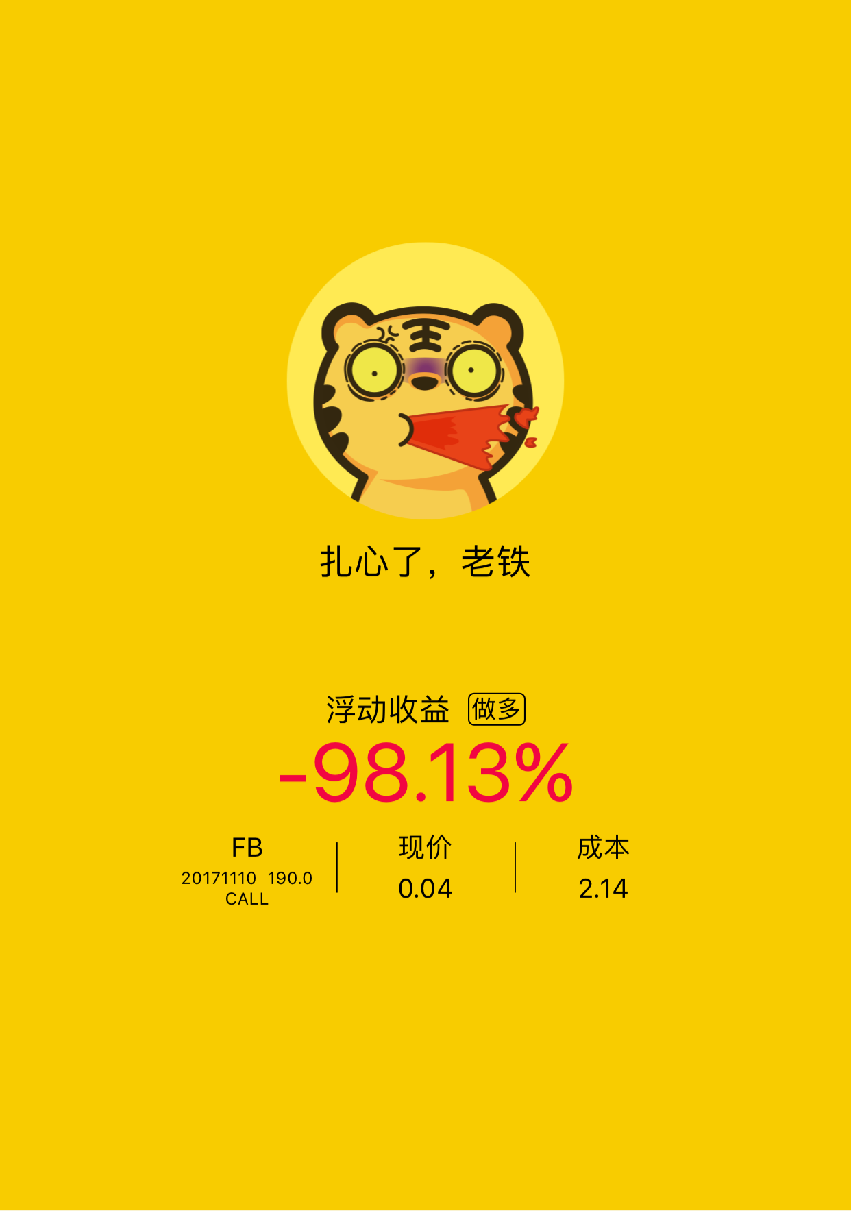 在赌财报这个圈子里,就连专研多年的大神们都得称我一声“爷”,简称:财神爷,此仇不报非君子,FB咱们的渊源就算结下了,今天立帖为证,哪里跌倒就在那里爬起来,下次还是财报前的call,年底见!