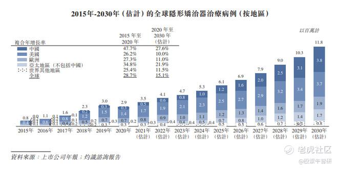 而美国和欧洲的隐形矫治市场却呈现相反趋势,增速预计放缓。另外,中国通过隐形矫治器解决的正畸案例数由2015年的4.78万例增至2020年的33.55万例,复合年增长率为47.7%,并预期将于2030年达到380万例,复合年增长率为27.6%。