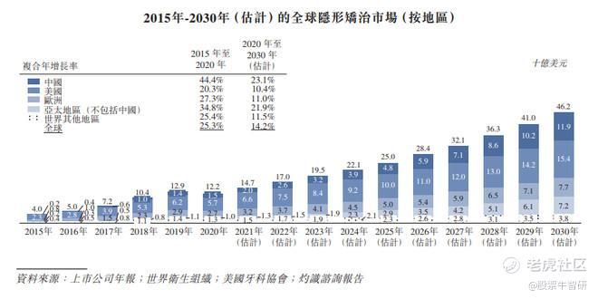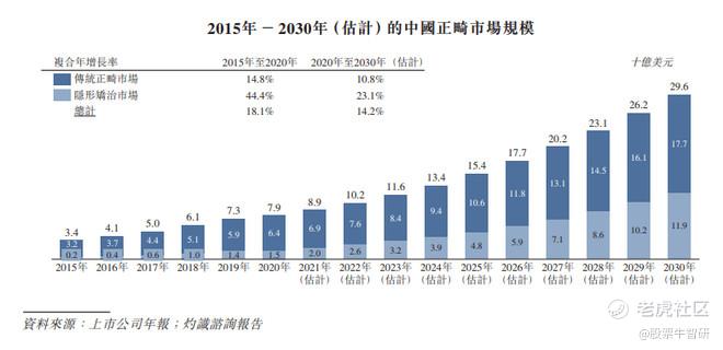 中国隐形矫治市场在2019年成为世界第二大市场。就零售销售收入而言,市场规模由2015年的2亿美元增至2020年的15亿美元,复合年增长率为44.4%,并有望于2030年达到119亿美元,2020至2030年的复合年增长率预计为23.1%。