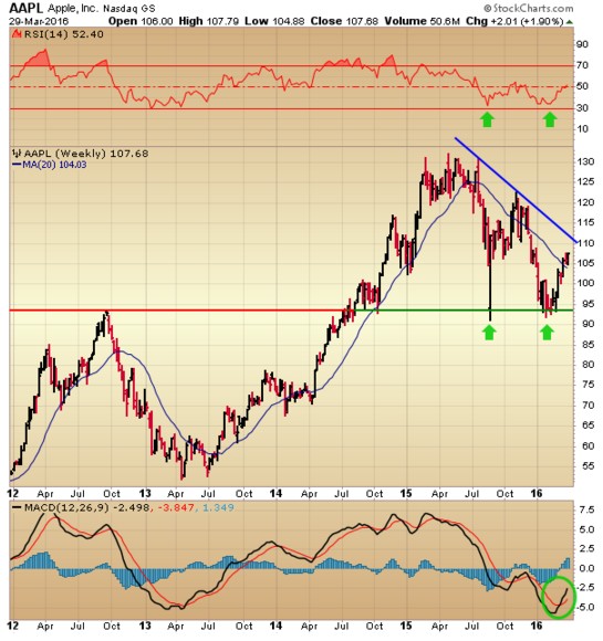 此轮反弹的底部支撑线正好位于2012年中期的阶段性高点附近,该位置也是苹果上季度财报利空后显著走低的位置,在此位置获得支撑后,股价逐渐回温,并无太多分歧。MACD也在2月份的反弹中出现金叉,反映到RSI指标上,我们可以看到在接近30超买区域时,RSI构筑的双底形态。
